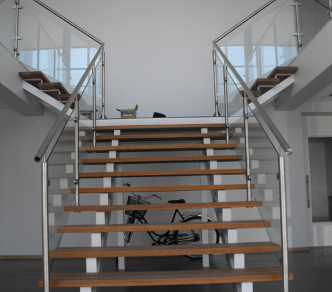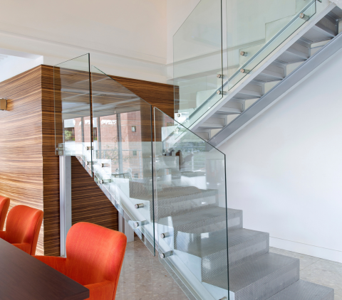 A commercial office space creates open concepts with the use of glass railings.